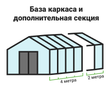 Длина базовой теплицы - 6,6 м., в комплекте: дверь-купе и две форточки в крыше.